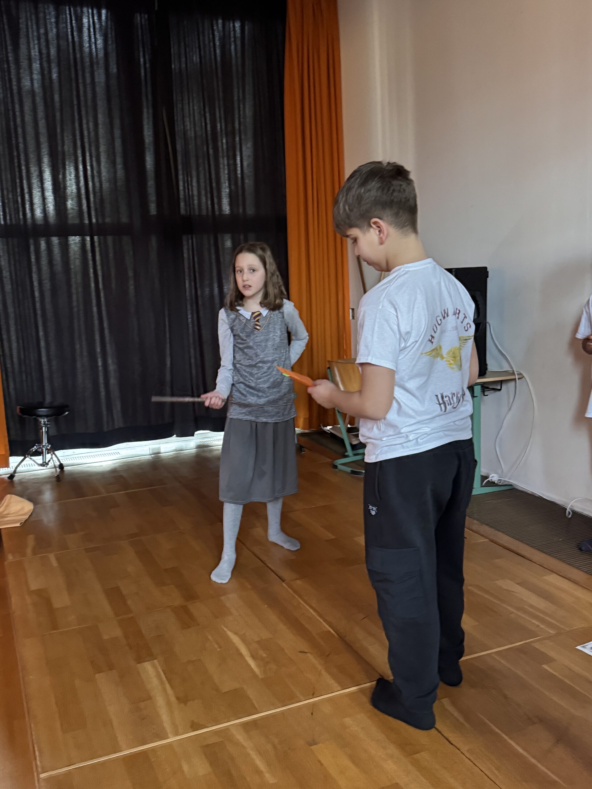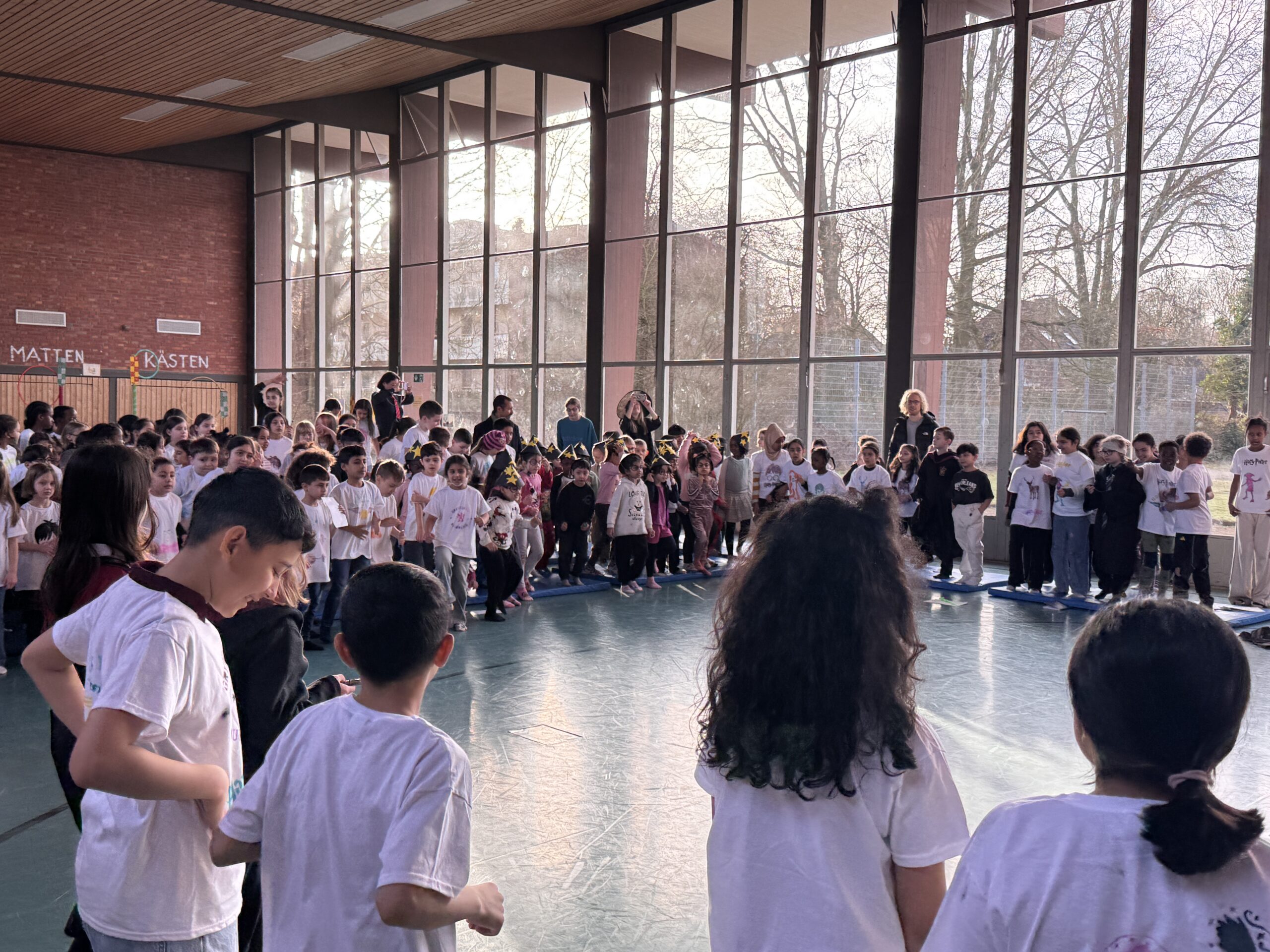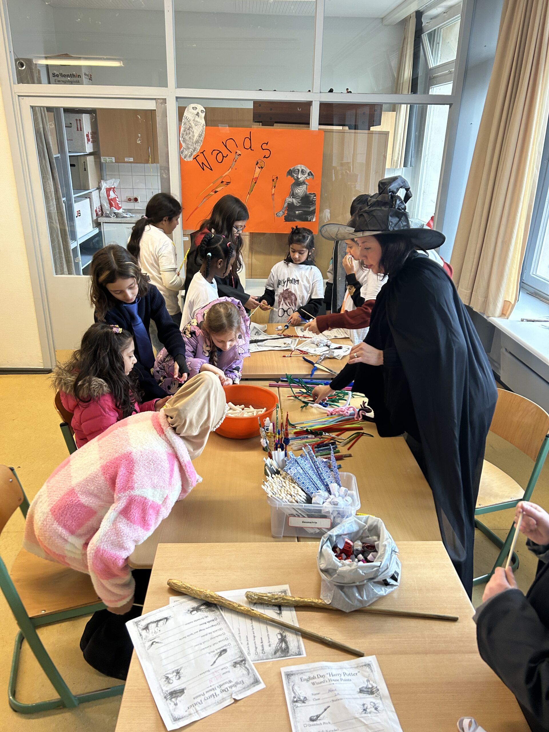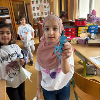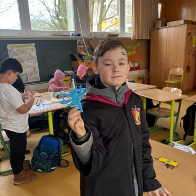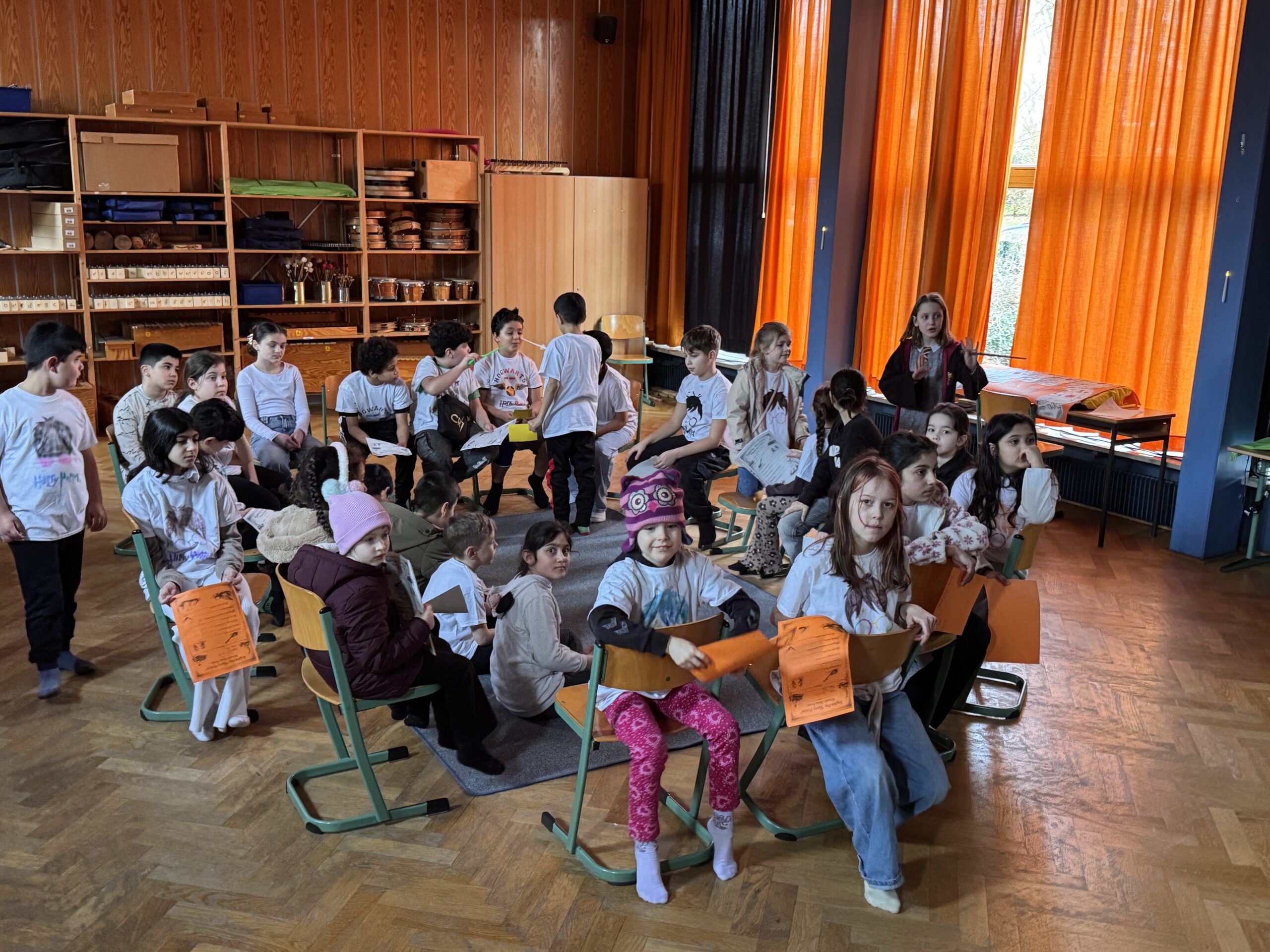 Nach einem gemeinsamen Auftakt in der Turnhalle begaben sich die Schülerinnen und Schüler auf eine magische Reise durch die Schule. Sie konnten ihre Geschicklichkeit beim Quidditch-Spiel unter Beweis stellen, magische Pflanzen und Zauberstäbe gestalten sowie gemeinsam knifflige Rätsel lösen. Sie stellten sich verschiedenen Aufgaben, probierten Zaubersprüche aus und traten in freundlichen „Battles“ gegeneinander an. Mit viel Begeisterung und Teamgeist tauchten die Kinder so für einen Tag in die Welt von Hogwarts ein.