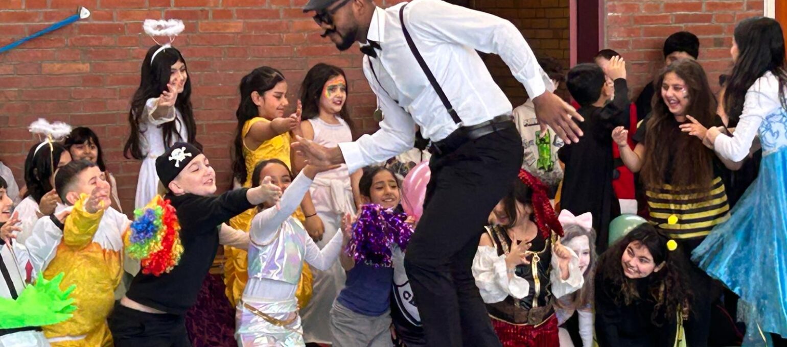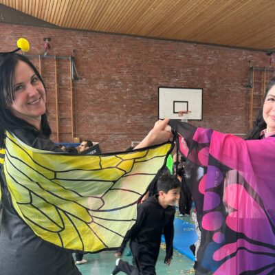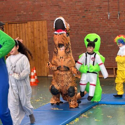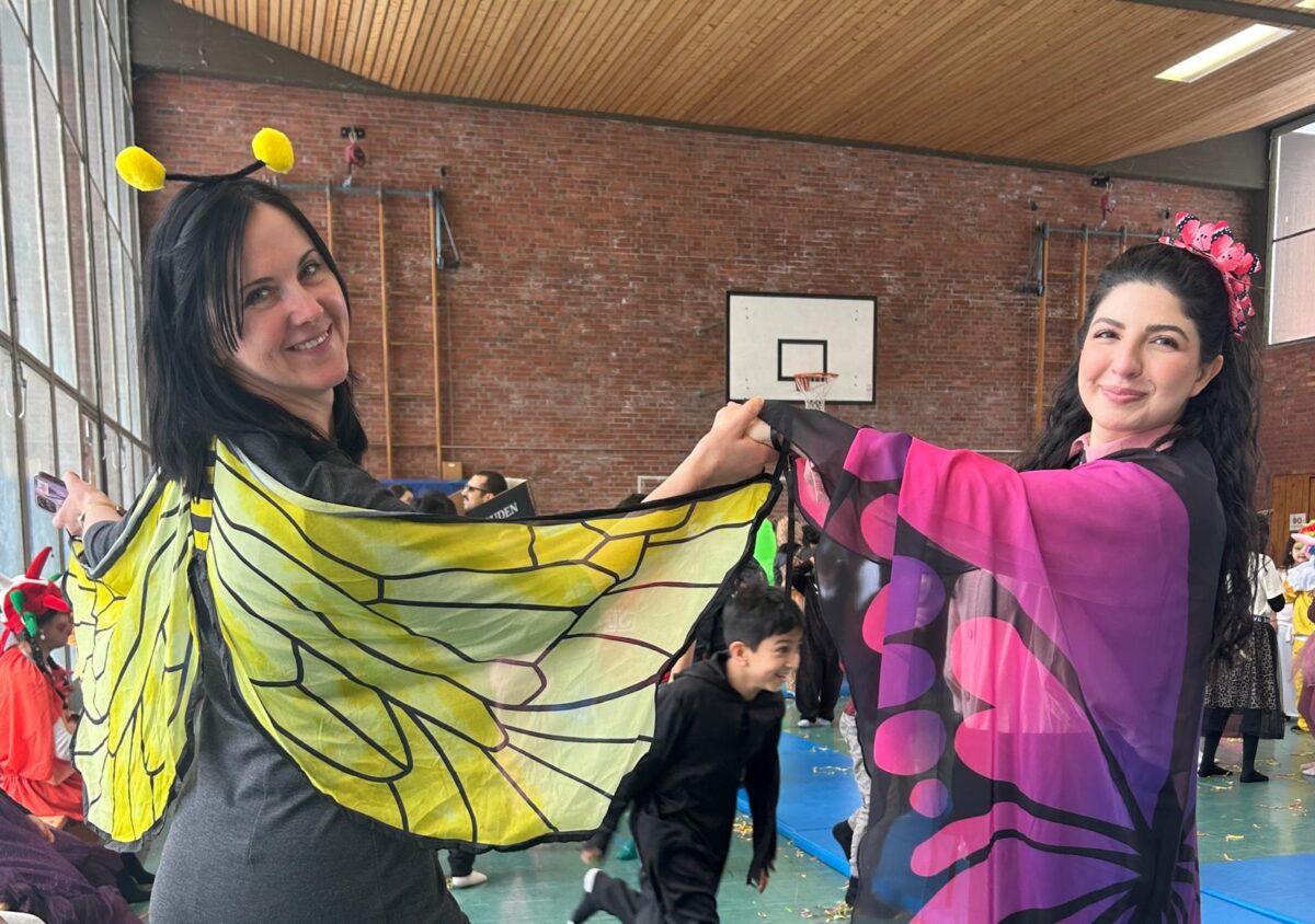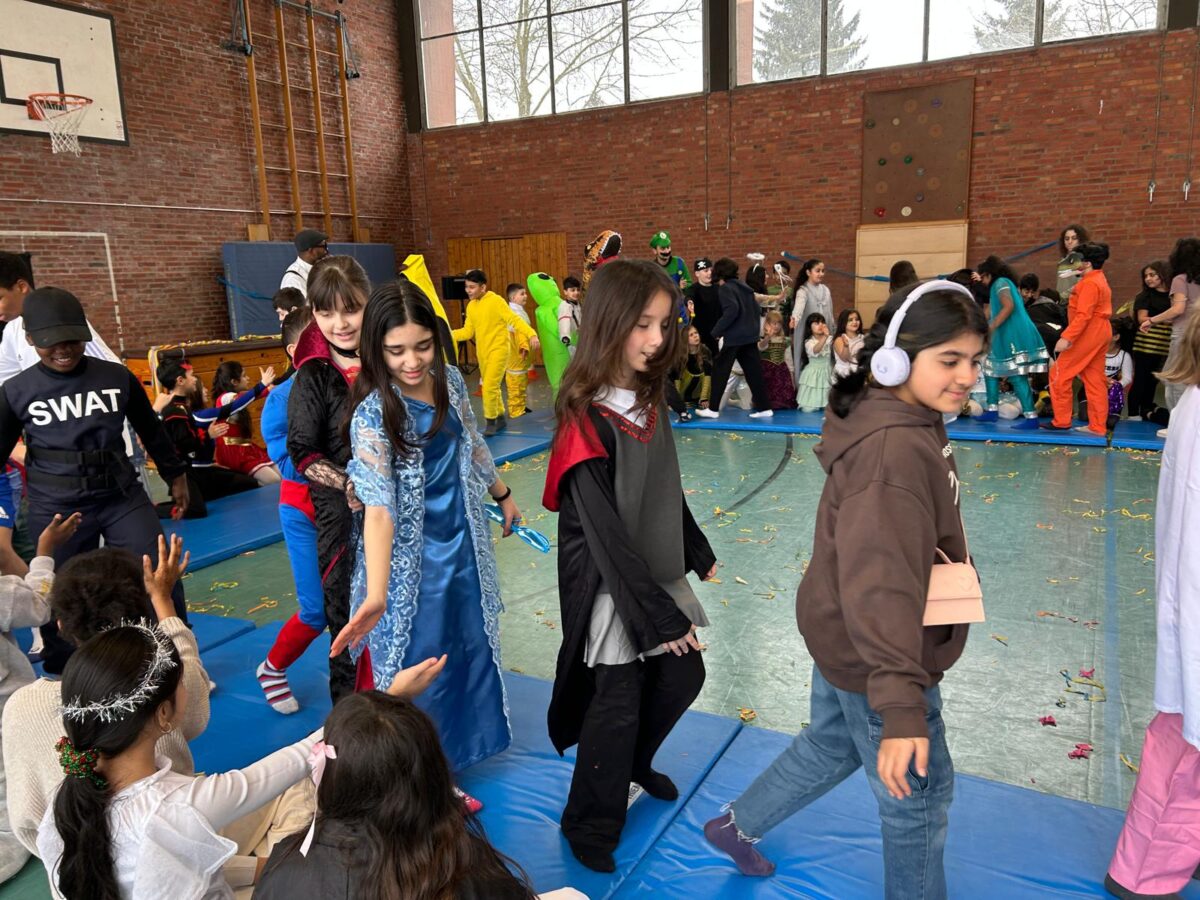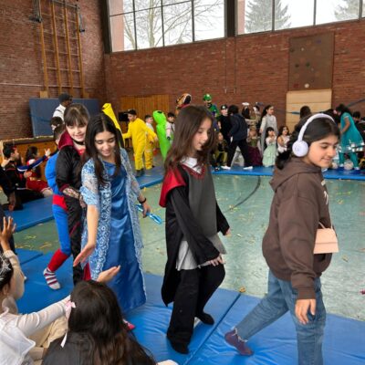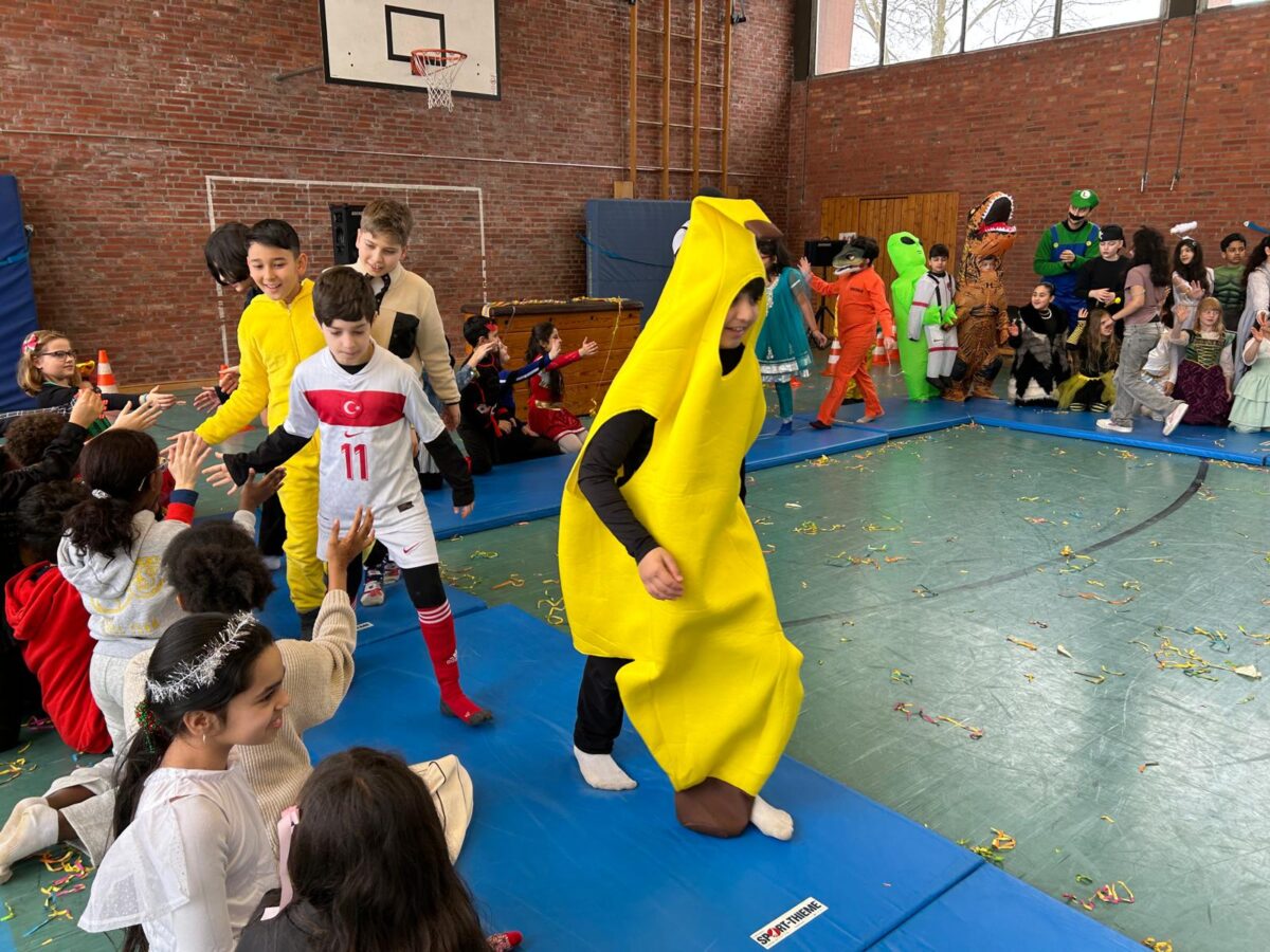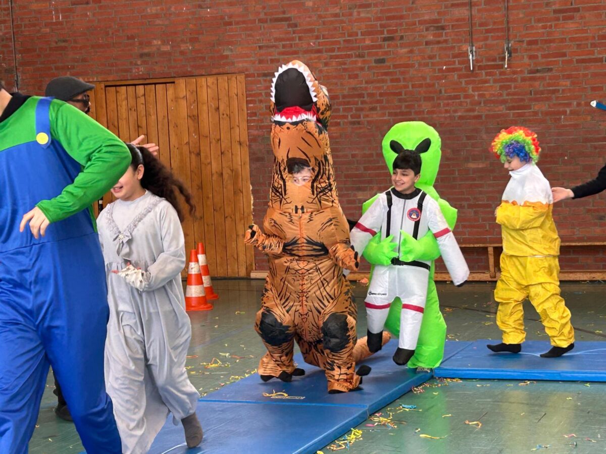 Ein besonderes Highlight war die gemeinsame Feier in der Turnhalle. Dort fand eine große Modenschau statt, bei der alle Kinder ihre fantasievollen Kostüme stolz präsentieren konnten. Im Anschluss verwandelte sich die Turnhalle in eine fröhliche Disco. Bei schwungvollen Liedern wurde gehüpft und ausgelassen getanzt. Die Stimmung war großartig!